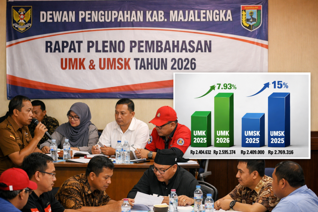 MAJALENGKA — Kabar baik bagi para pekerja di Kabupaten Majalengka. Upah Minimum Kabupaten (UMK) Majalengka Tahun 2026 resmi direkomendasikan naik sebesar 7,93 persen setelah disepakati dalam sidang pleno Dewan Pengupahan Kabupaten Majalengka.